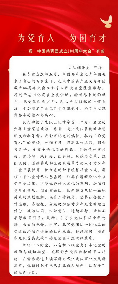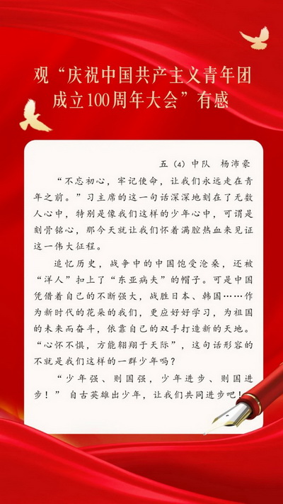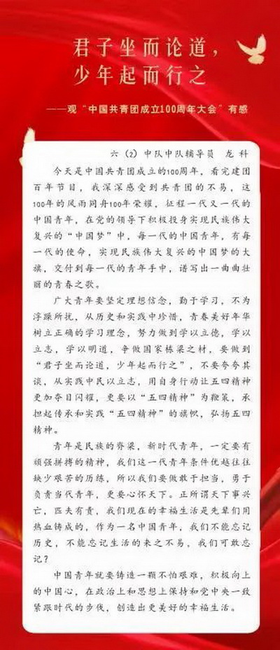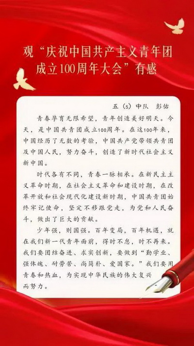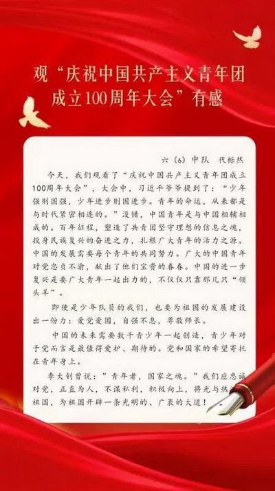 All the teachers in our school watched the live broadcast of the congress and listened to the general Secretary's important speech to celebrate the 100th anniversary of the founding of the Communist Youth League of China (CYLC).