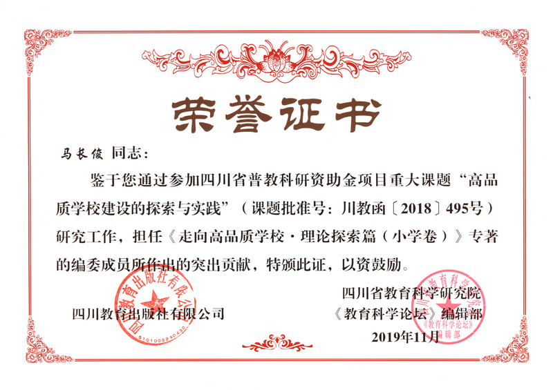 2018起,学校在四川省教育科学研究院高品质学校建设课题组引领下,走向高品质学校建设,其经验于2022年在《中国教育报》上面向全国介绍。学校“十四五”高品质发展规划获四川省一等奖。