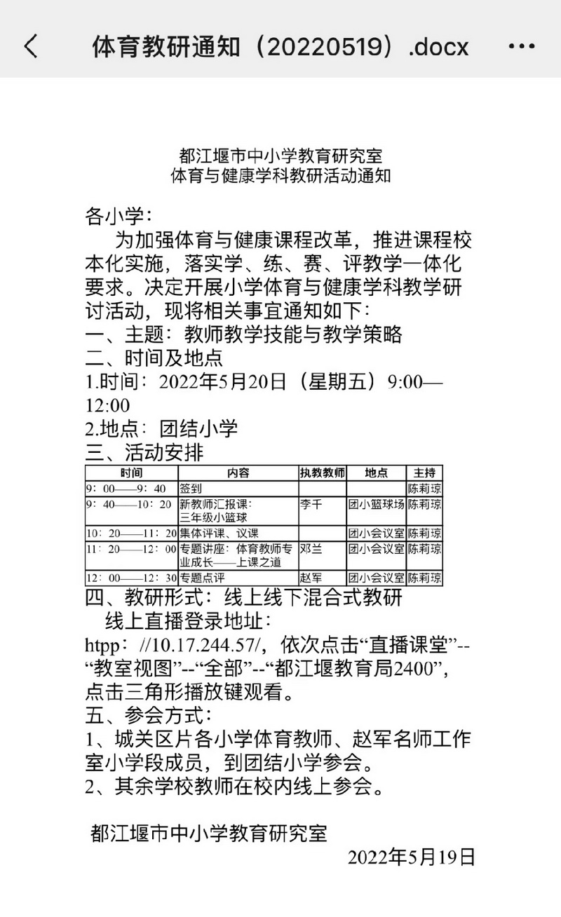 应疫情防控要求,本次活动采用线上+线下混合式教研的形式进行。在中小学教育研究室体育教研员赵军老师解读本次活动的意义后开启了活动议程;