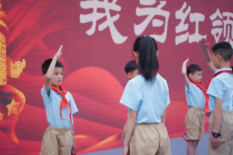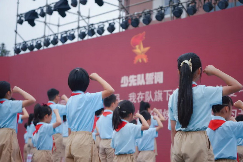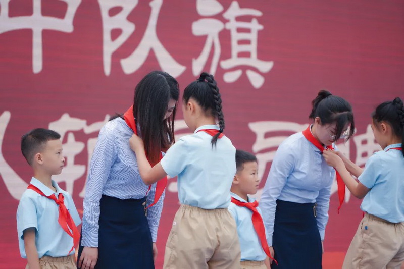 优秀党员同志为接班人系上鲜艳的红领巾,传承革命意志;老队员献上祝福,祝愿他们茁壮成长,并与新队员一同庄严宣誓,为继承祖国复兴的伟大志愿,为传承共产主义思想的不灭理想庄重承诺。