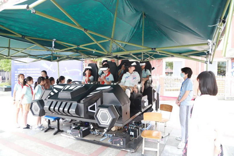学校将三维太空训练模拟器、VR体验器等大型设备搬进校园,全校近2000名孩子每人都进行真切体验,通过体验航天员艰辛训练,感受先进的科学技术,从而体会科学的魅力。