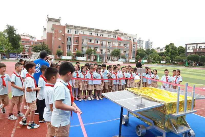 学校在操场周围布置了各种火箭模型、卫星模型、神州舱模型、太空车模型、航天员英雄照片等,孩子们在老师的带领下,依次参观并聆听辅导员老师的生动讲解,并不时互动。