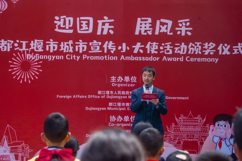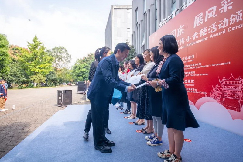 With the vision of harvest, facing the autumn wind in October,on September 29th, Our teachers and students attend Dujiangyan City Promotion Ambassador Award Ceremony hosted by Foreign Affairs Office of Dujiangyan Municipal People's Government and Dujiangyan Municipal Education Bureau and co-organized by Dujiangyan Convergence Media Center.