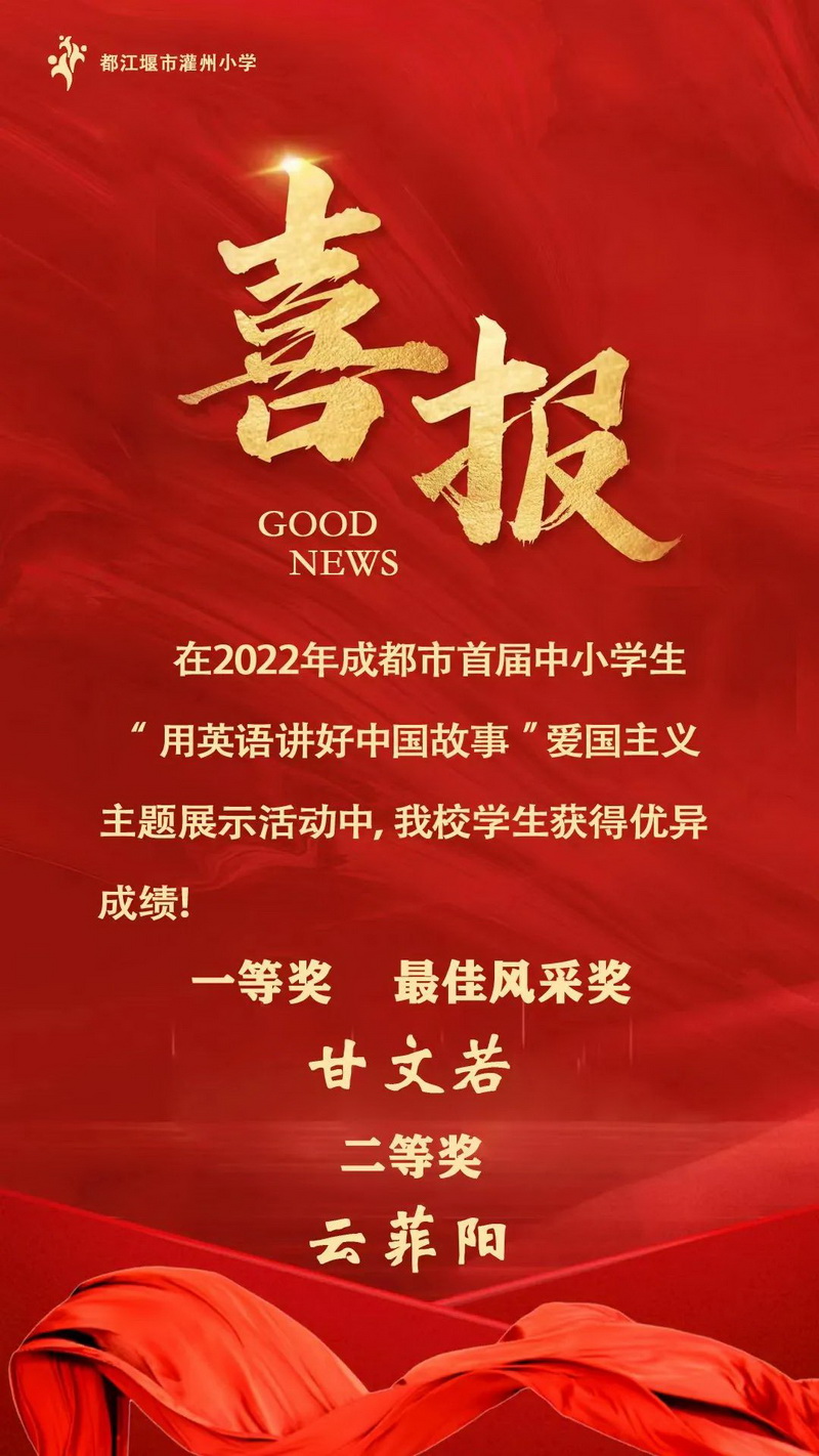 春花秋实,颗粒满仓!在刚刚结束的成都市“小学生用英语讲中国故事”展评活动中,我校2023届学生甘文若同学的作品‘The Legend of Hua Mulan’荣获成都市一等奖。云菲阳同学的作品‘Chinese Zodiac’荣获成都市二等奖。
