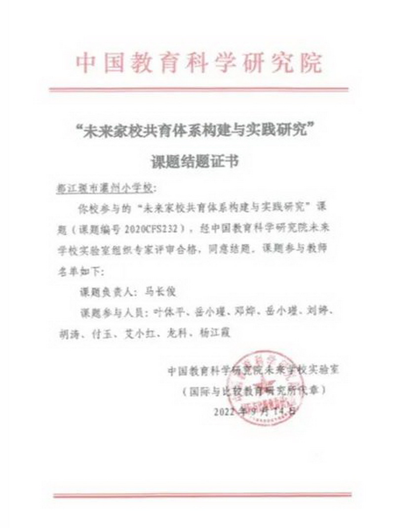 金秋九月,万物丰收。9月14日,我校参与的国家级课题“未来家校共育体系构建与实践研究”课题(课题编号2020CF232),经中国教育科学研究院未来学校实验室组织专家评审合格,完成结题。