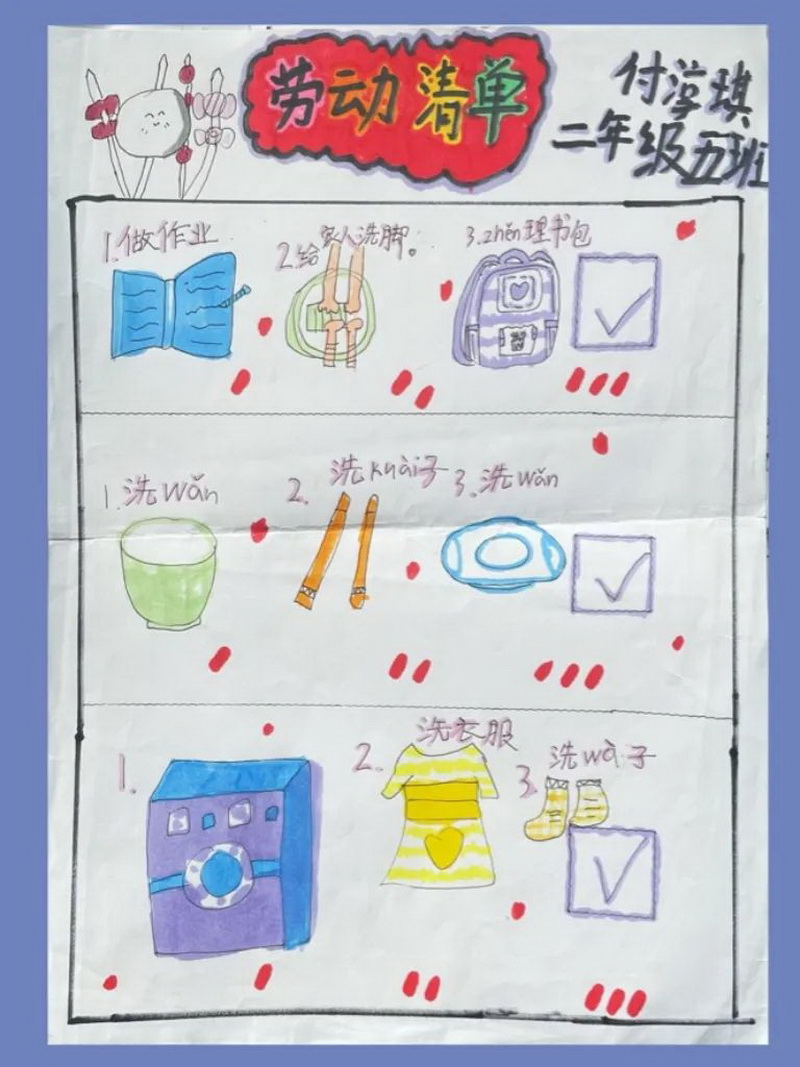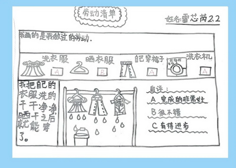 Labor education in the new era emphasizes practical education, learning to learn and create in real and rich situations. Design a list of housework, focus on children's self-care ability, exercise life skills, and achieve home-school co-education.