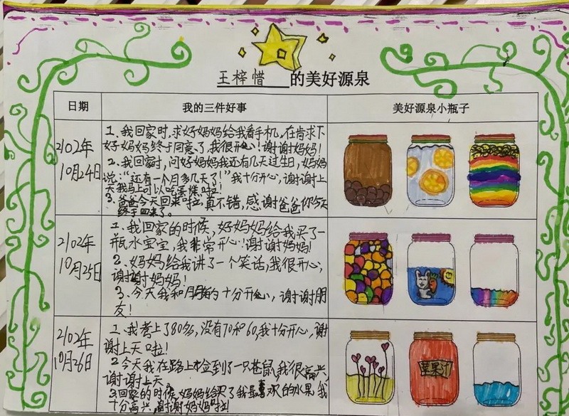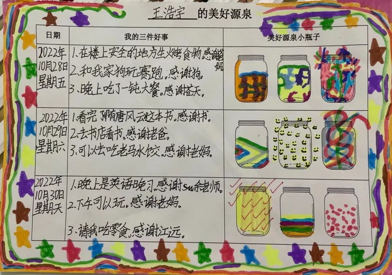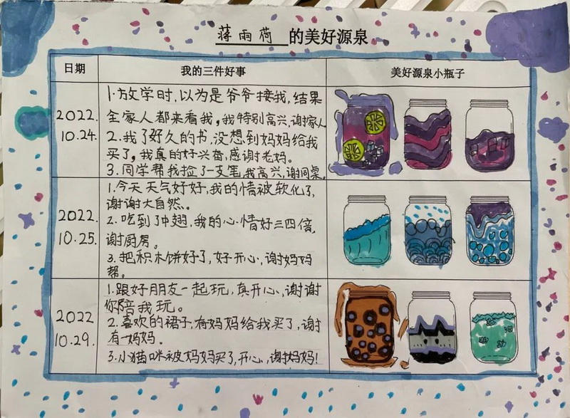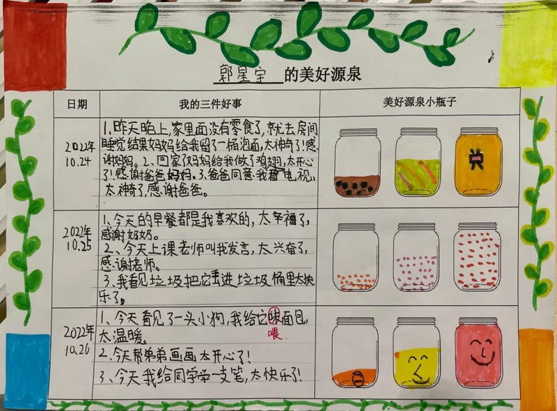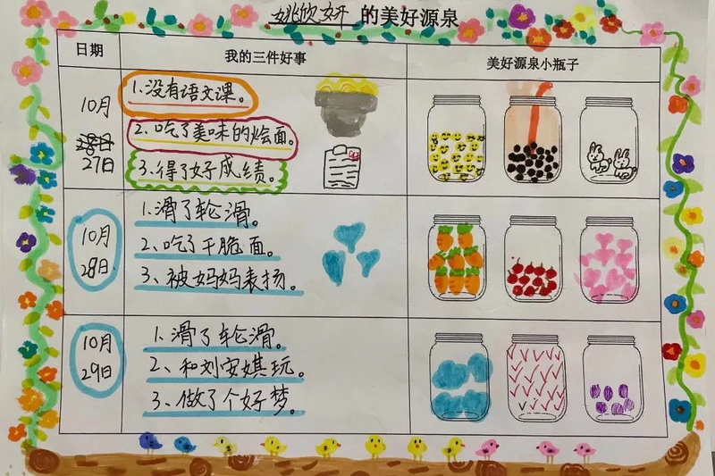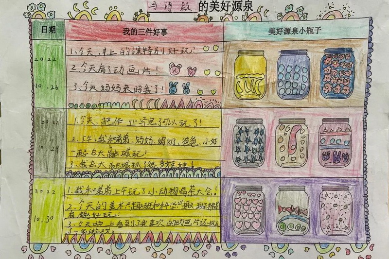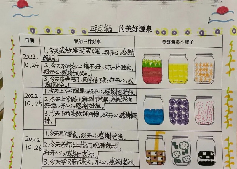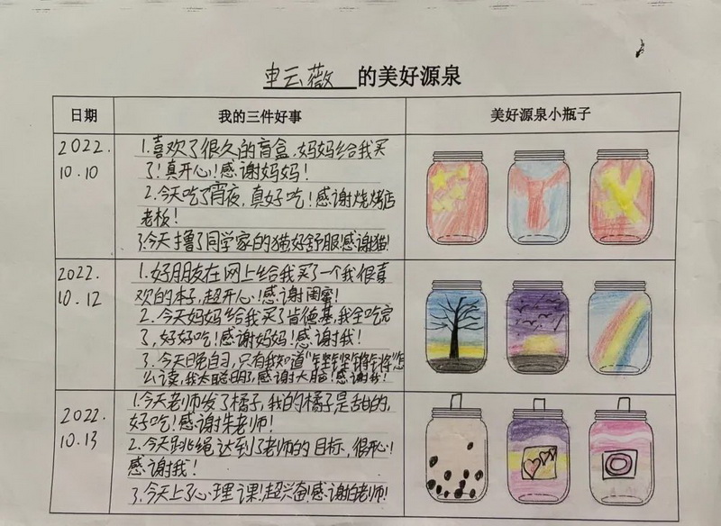 随后,借助积极心理学技术,指导学生利用纸笔记录每天发生的三件好事。