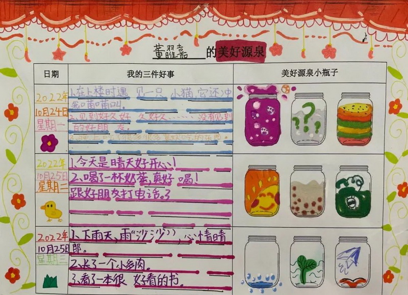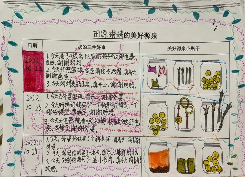 “三件好事”是积极心理学家马丁·塞利格曼提出的能有效提升人的积极情绪的方法,通过学习和坚持该方法能够帮助学生发现身边的美好,保持积极乐观的心态,培养开朗、合群的健康人格,提高幸福感,建立良好的人际关系。