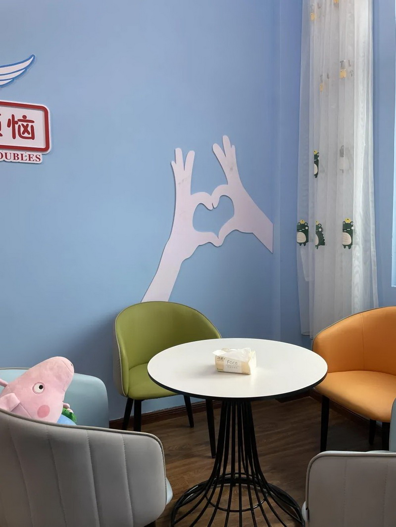 There are reception area,individual counseling area, sandtable area, reading area,vent area and group counseling area.