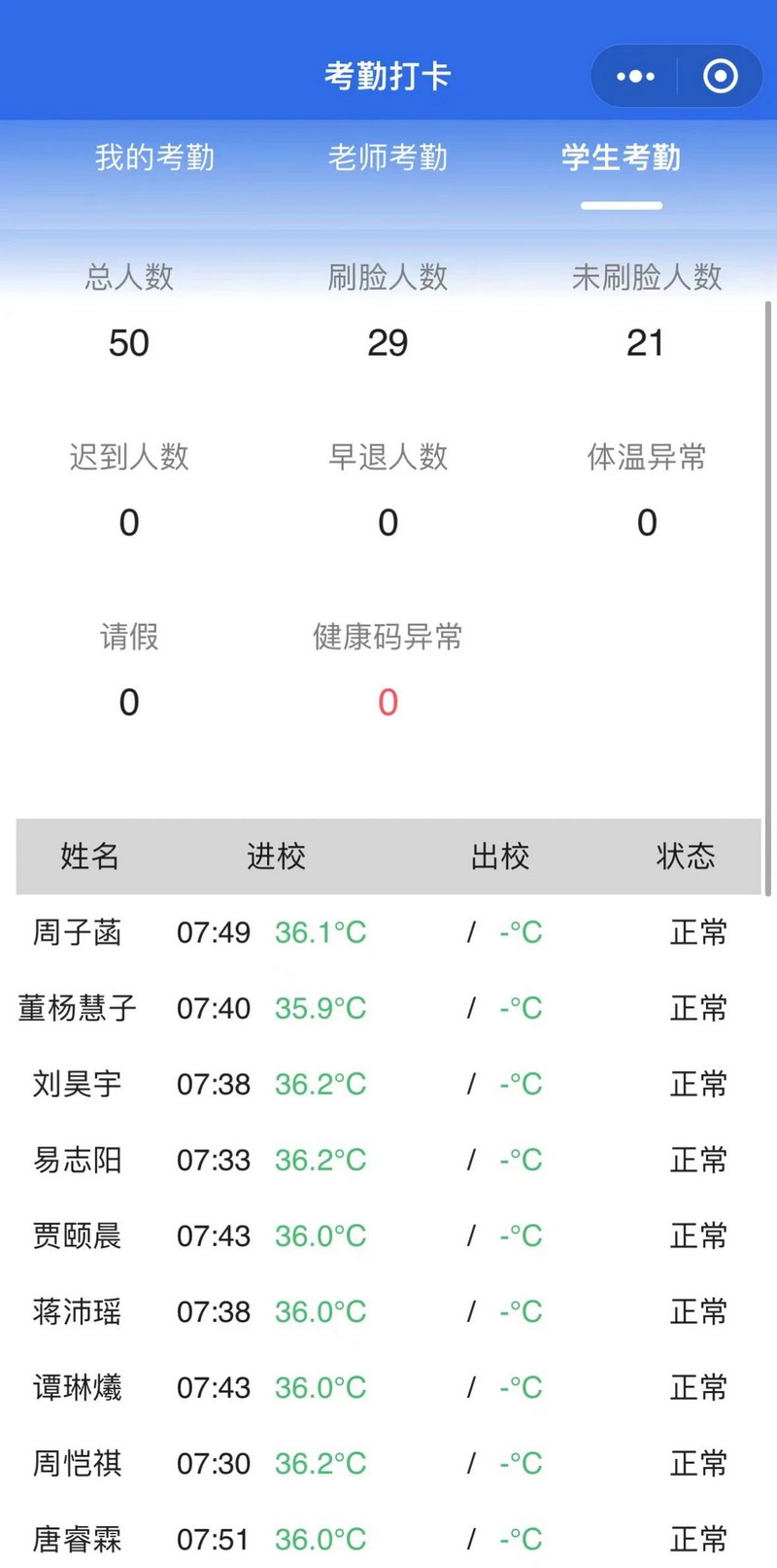 Face recognition is used to submit attendance, accurately record teachers' time on and off duty, and ensure scientific attendance data.