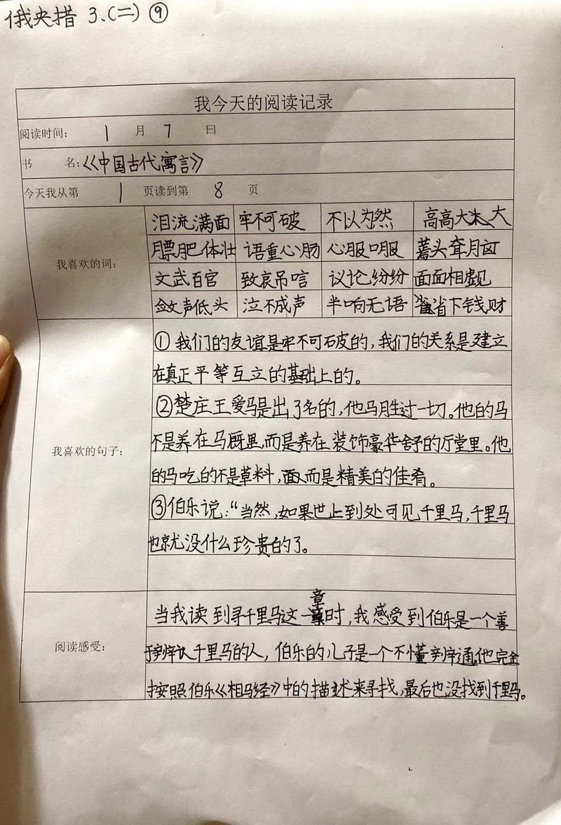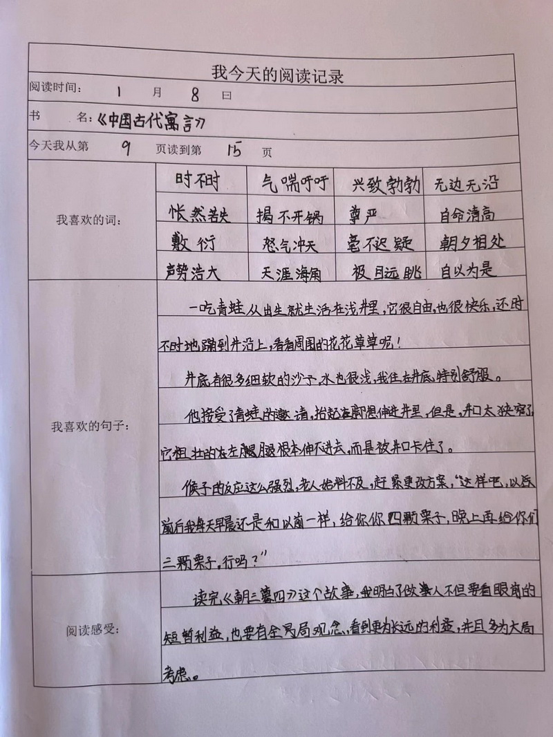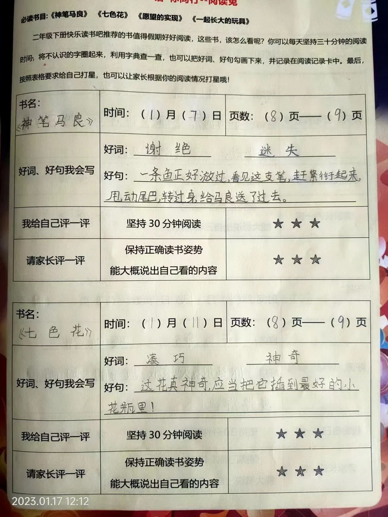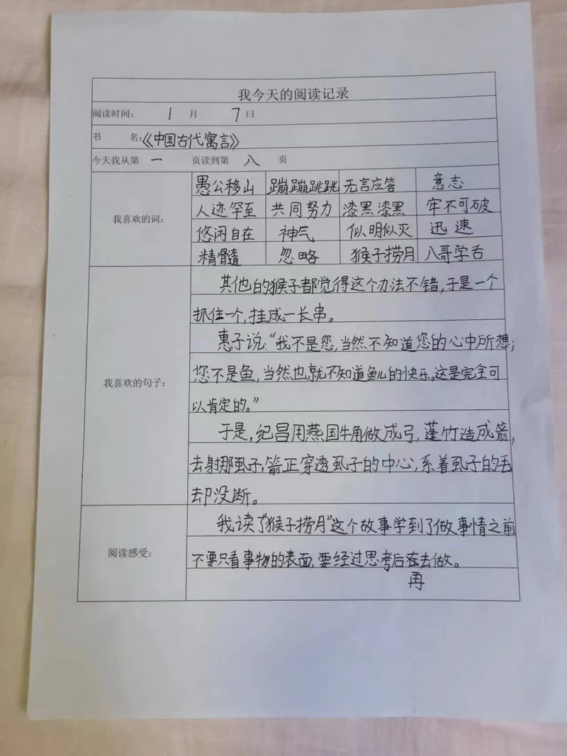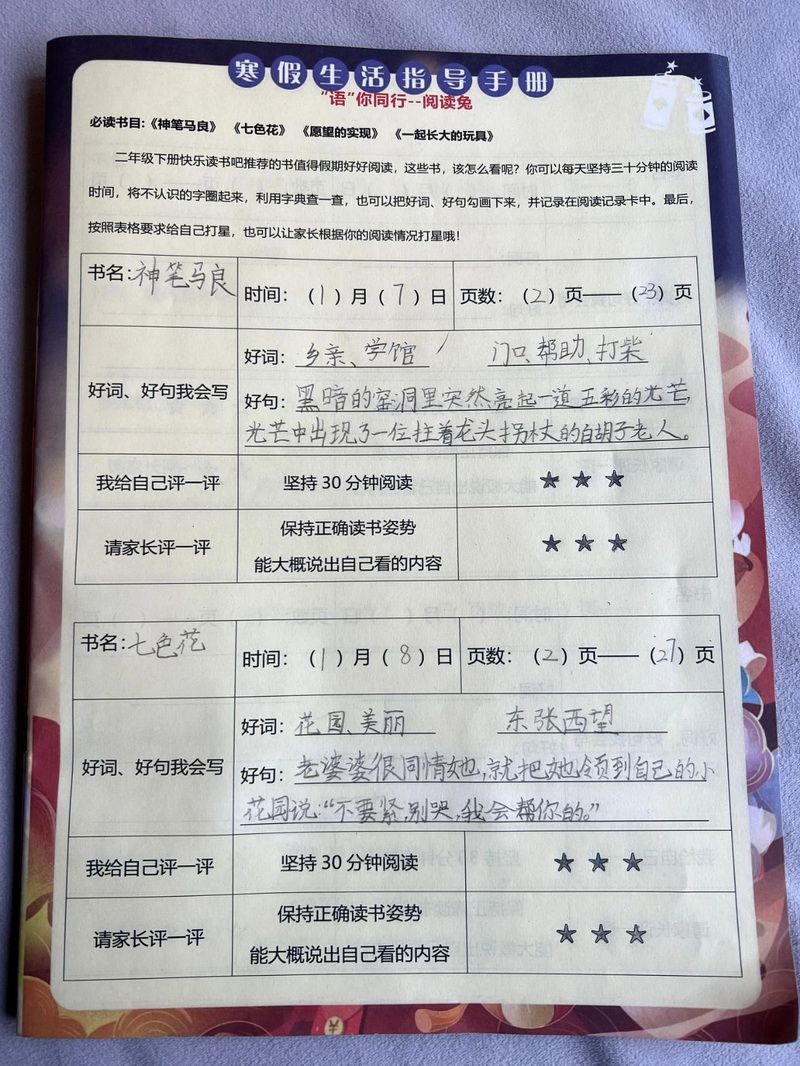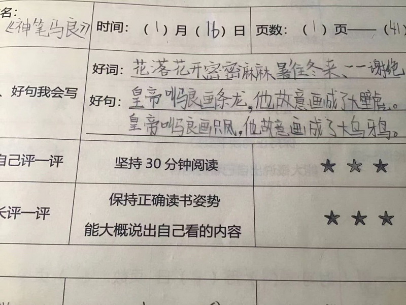 孩子们认真完成的阅读记录Reading records carefully completed by children