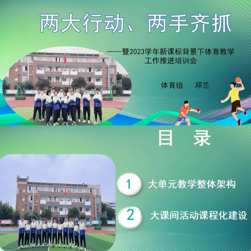 本次教研活动由体育学科校聘名师、学校质量监控中心干事邓兰老师主持并解读;体育组全体教师参加。通过本次会议的召开,全体体育教师将严格按照会议要求及工作部署执行新学期的教育教学工作。以集体的方式站立,扬长避短、砥砺前行。将大单元教学计划有效落实到常态教学中,有利于学生切实掌握1——2项专项运动技能。真正做到享受乐趣、增强体质、健全人格、锤炼意志。