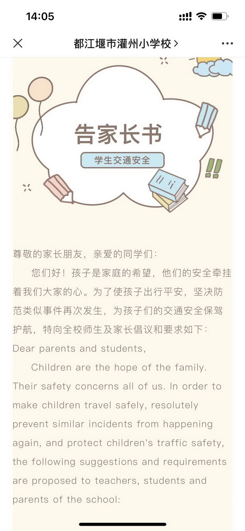 Our school sentthe "Traffic Safety Notice to Parents" through WeChat.