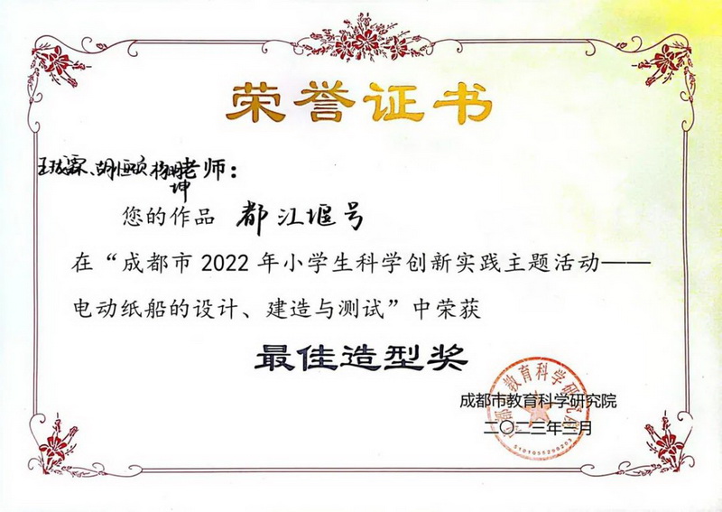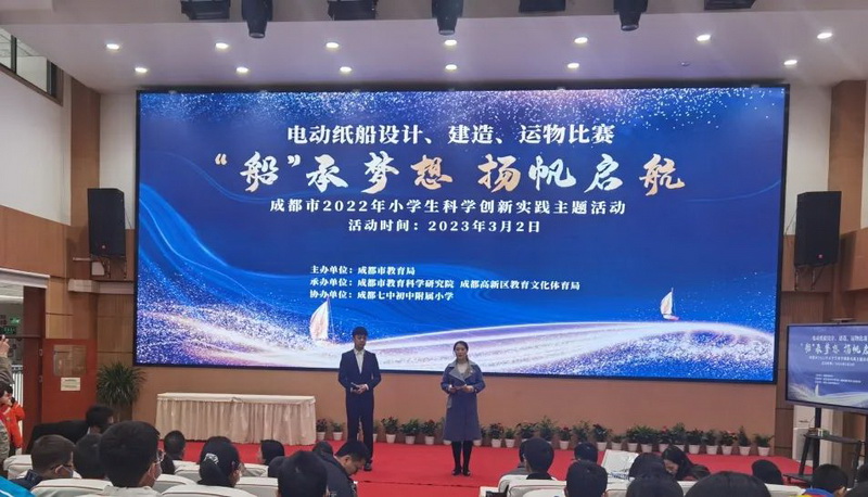 为认真落实《教育部办公厅关于加强小学科学教师培养的通知》(教师厅函〔2022〕10 号),成都市举办了“电动纸船的设计、建造、运物”比赛。