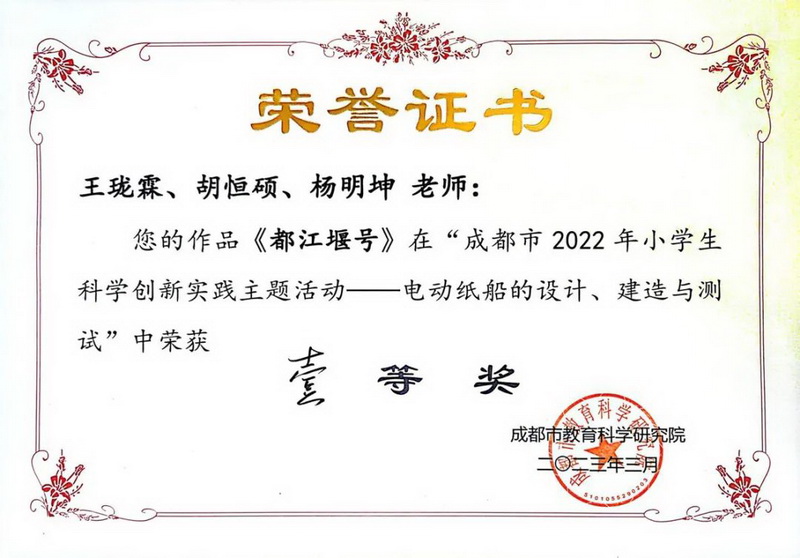 活动中,我校教师王珑霖、胡恒硕、杨明坤在教研员李嘉文的指导下,创作了名为“都江堰号”的作品。“都江堰号”模仿中国古代“画舫”,以都江堰悠久美丽的山水文化为根基,以中国古代造船、建筑文化为底蕴,利用废旧纸板、塑料瓶等环保材料,打造出一艘古香古色的船只,在一众优秀作品中脱颖而出,荣获一等奖,并获得最佳造型奖的殊荣。