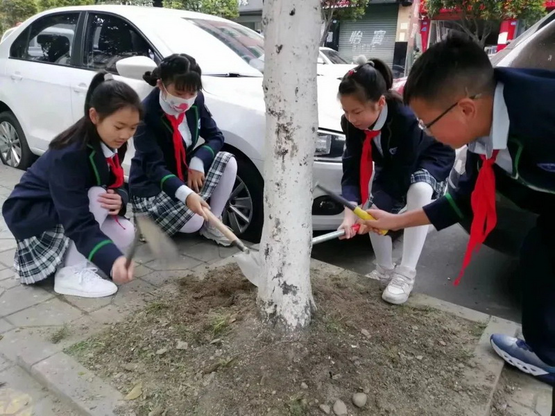中段同学们,在老师的组织下,对校园外道路两侧的桂花树进行了松土施肥的志愿劳动。小志愿者齐心协力、干劲十足。