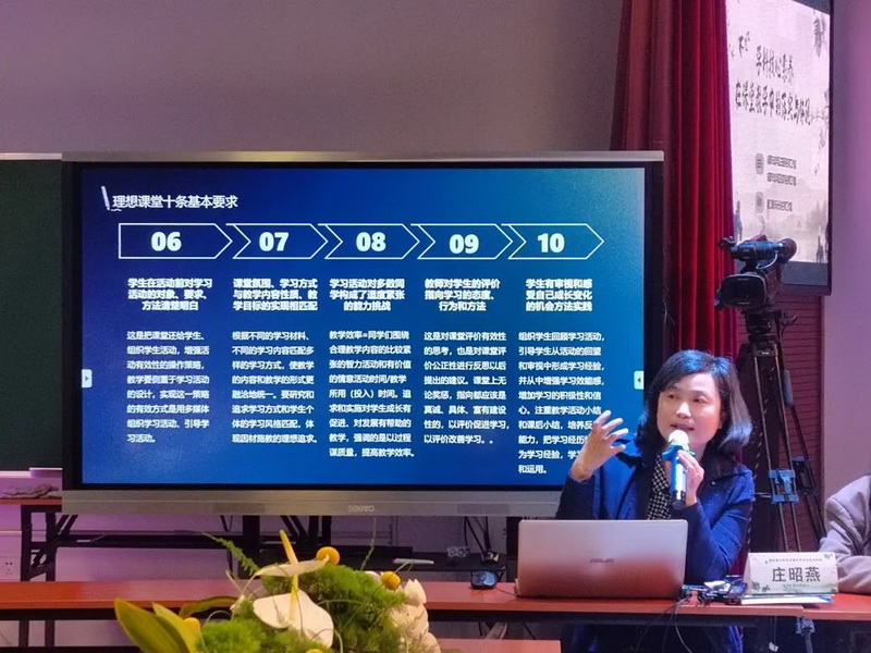 工作室领衔人庄昭燕分享了《让核心素养落地,为知识运用赋能》的专题讲座。庄校长从“什么是核心素养”、“什么是学科核心素养”、“语文学科核心素养”、“核心素养在课堂教学中的落实与体现”四个方面带领了参会老师深入地理解了核心素养和语文课堂的关系,让老师在课堂中落实培养学生核心素养指明了方向。