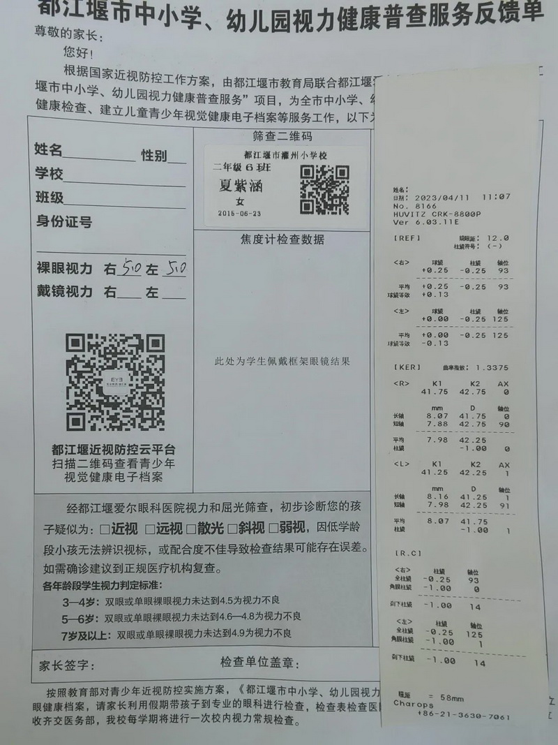 Paying attention to students' vision health has always been the focus of our school's work, all teachers and students attach great importance to this vision test, and all class teachers uniformly receive the students' vision physical examination file form before the examination, and standardize the filling in and vision-related information. Parents can view the test results by scanning the QR code of the information assigned to the student.