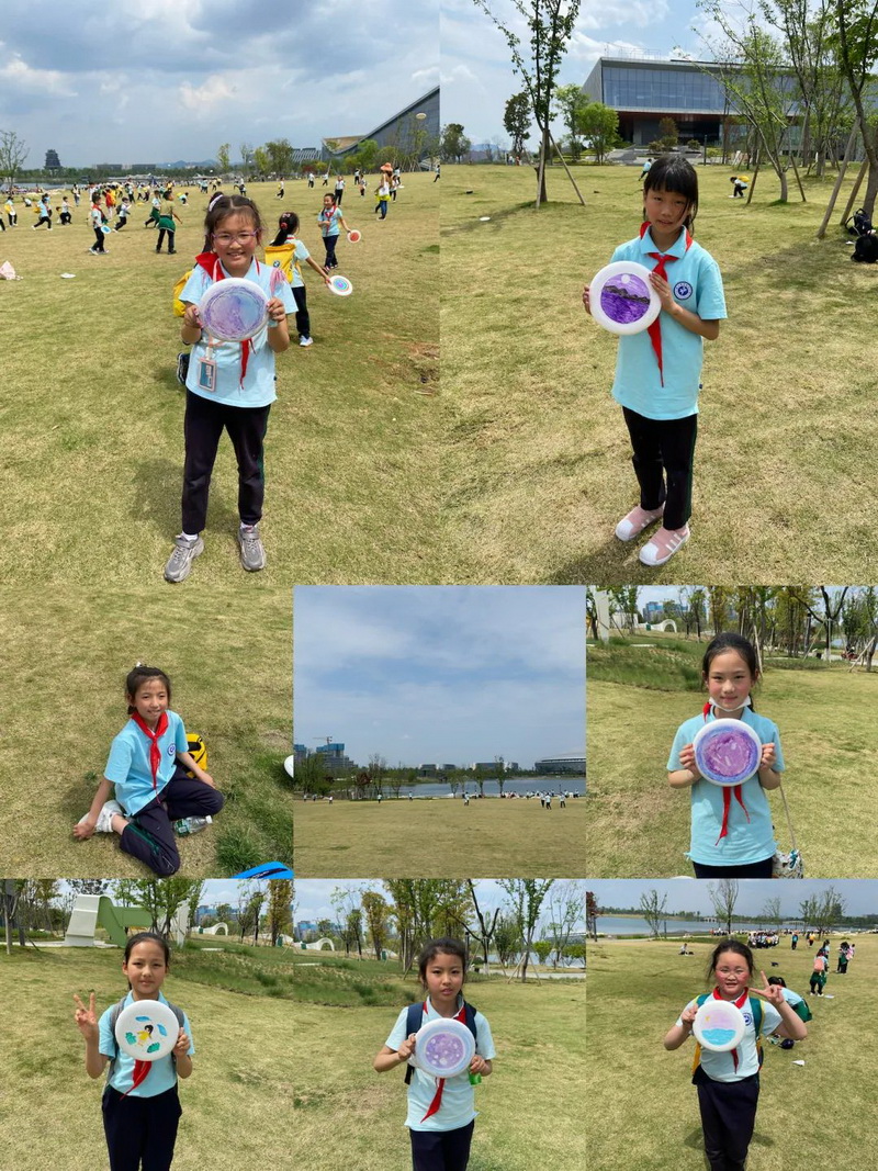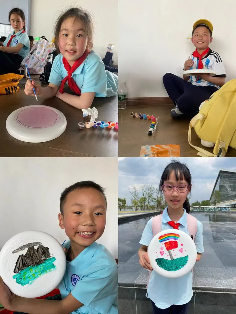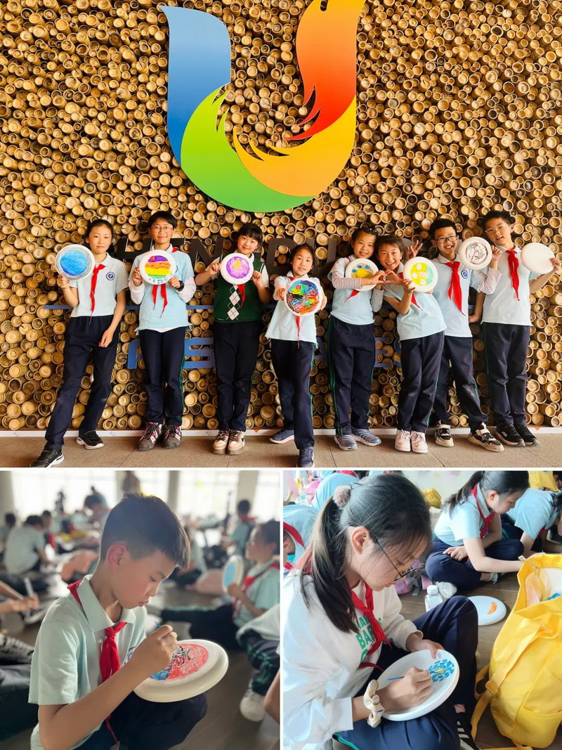 了解了运动馆的设计理念和理解了大运会的举办理念后,同学们来到美术馆,为自己的飞盘绘制了一幅幅美丽又有创意的图案。
