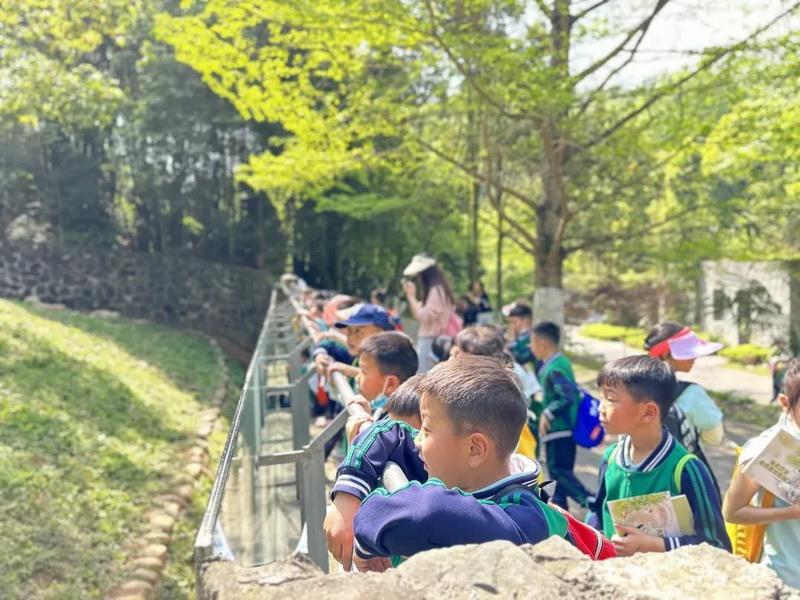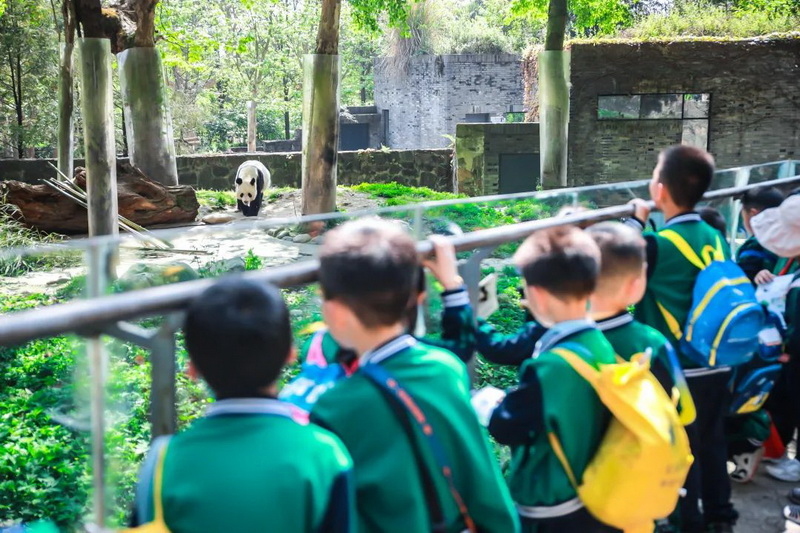 孩子们走进熊猫基地,深入探访大熊猫的栖息地,近距离观察了大熊猫的一些行为表现。孩子们通过沉浸式了解,关注大熊猫保护,并通过写祝福、系红丝带的方式加入到了对大熊猫的保护队列中。The children walked into the Research Base of Giant Panda Breeding and observed the giant pandas up close.