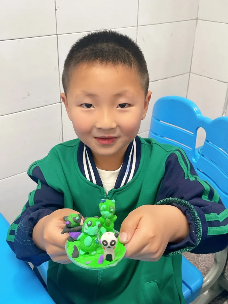 在懂得了大熊猫的珍贵后,孩子们利用自己在美术课、劳动课上学习到的本领,用画笔、粘土创造了自己心目中的大熊猫,真正做到了创新精神与创作能力相结合。