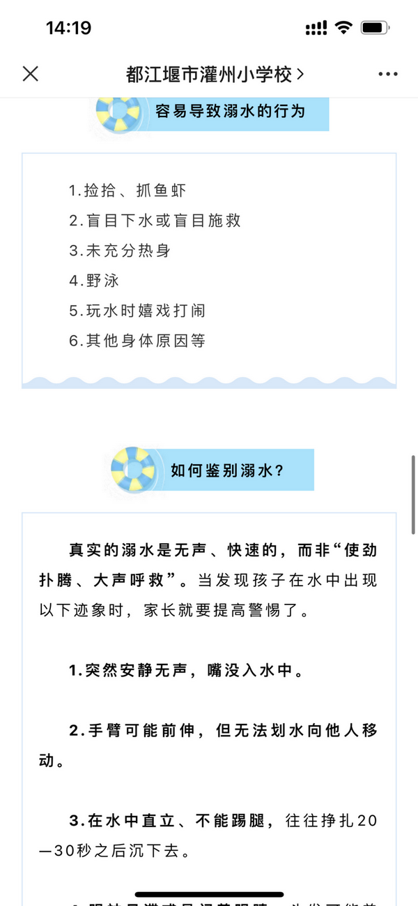 The school uses the WeChat official account to push a letter to parents about drowning prevention, popularization of drowning prevention knowledge,so that parents can understand the relevant knowledge of drowning prevention, enhance parents' awareness of drowning prevention safety.