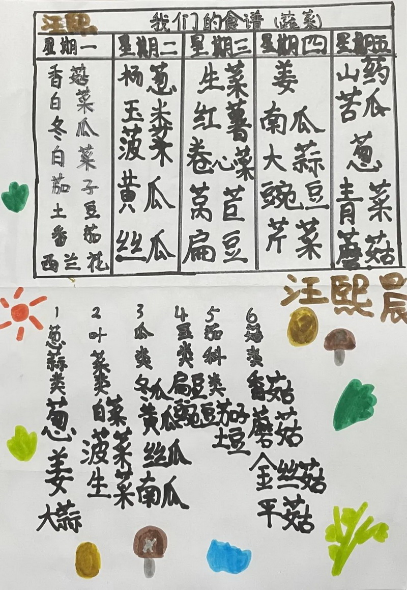 Learning to distinguish vegetables and classify them in class, the children had rich imagination, from the color, the taste, the season, the edible parts. They also classified the vegetable portion of our weekly diet from the daily situation.