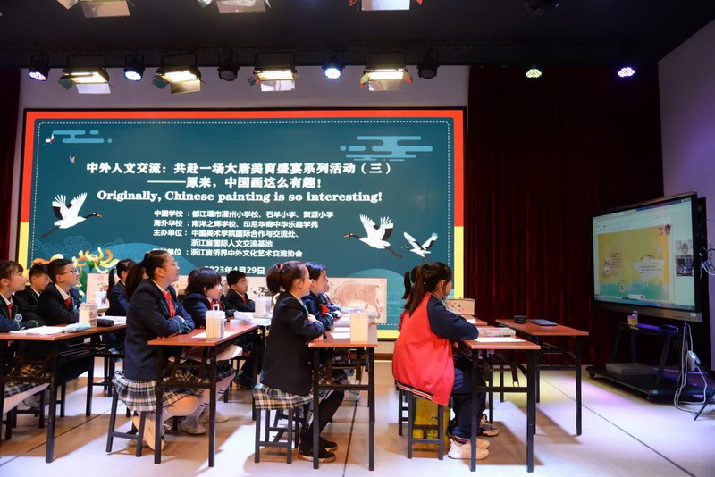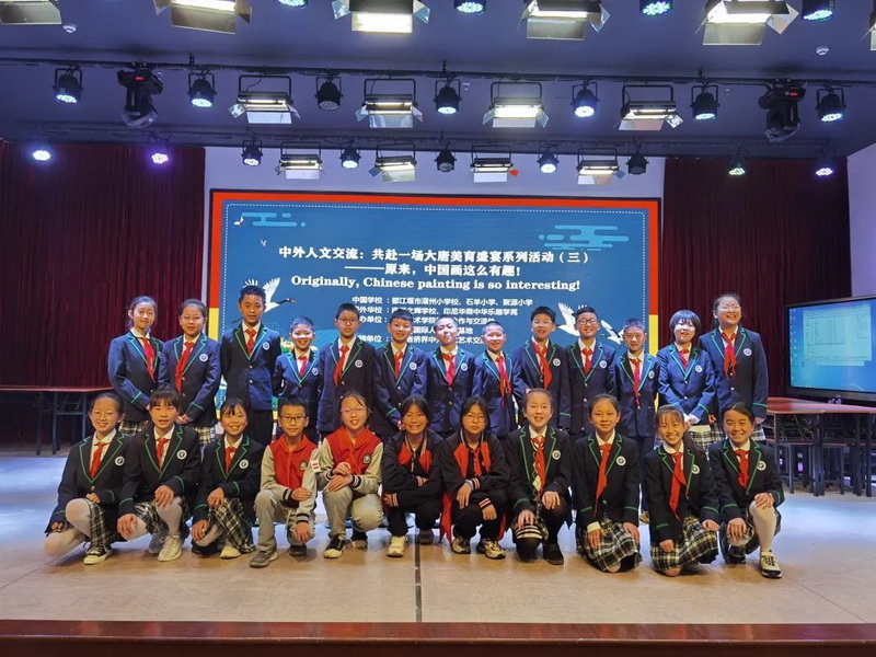 On April 29th, our school participated in the live class "Chinese Painting is so Interesting!" which was supported by the International Exchange and Cooperation Office of China Academy of Art. The third international live class was held successfully. Since the first class started on April 1, three sessions have been held successfully in the past month. Today, the children from Guanzhou Primary School, Shiyang Primary School and Juyuan Primary School in Dujiangyan City, Sichuan Province, under the guidance of teacher Liu Zehua from China Academy of Art, came to interact with the children from Nanyang Zhi Hui School in Medan, Indonesia and the Chinese Fun Academy in Indonesia, and experienced the interest of different cultural exchanges.
