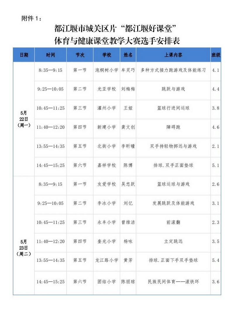 为进一步增强学校课堂建设能力,营造浓厚的教育研究氛围,推进课堂变革,提升教学技能和教学质量,根据市教育局“好课堂”文件精神,5月22日都江堰市城关区片体育“好课堂”现场课教学大赛在我校顺利举行,本次“好课堂”教学大赛共计12堂课为期两天,分别由都江堰市城关区片各兄弟学校优秀教师参赛,参赛老师选择水平一至水平三的不同学段和教学内容进行教学,教学内容涵盖田径、排球、篮球、体操(技巧)和民族民间传统体育项目五大类。