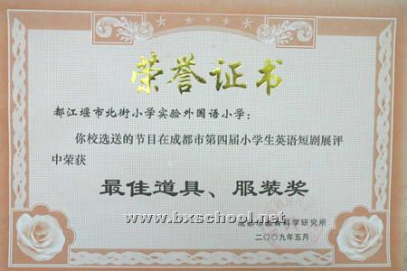 》在成都市第四届小学英语艺术节暨小学生英语短剧及口语能力测试比赛中荣获“二等奖”及“最佳道具、服装奖”。