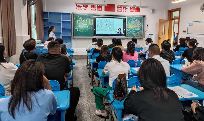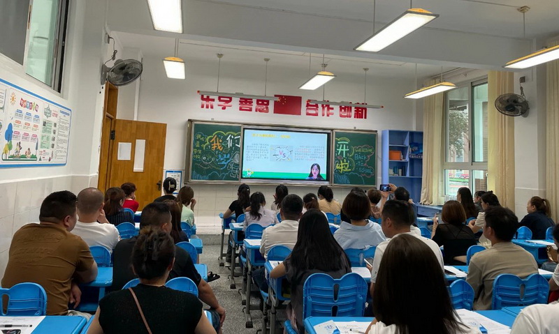 一年级新生家长在教室参加家长会。First grade parents attend the meeting in the classroom.