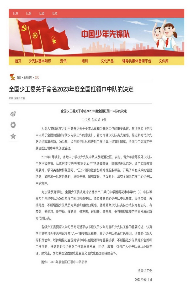 近日,全国少工委公布了2023年度全国红领巾中队名单,我校四(4)晨曦中队荣获“全国红领巾中队”称号。