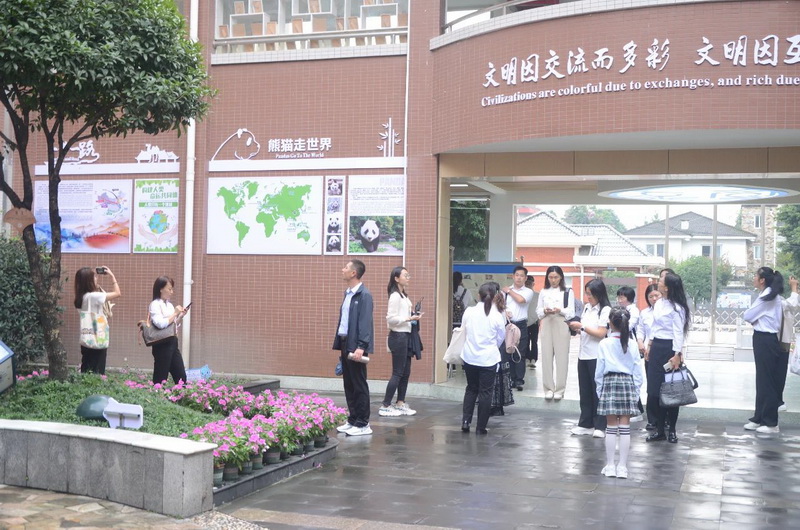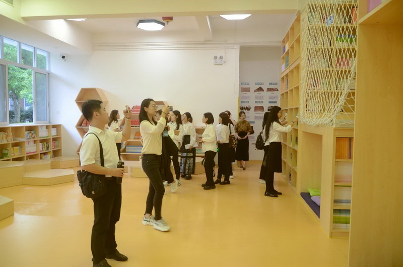 在红领巾志愿者的带领下参观校园。Visiting the school.
