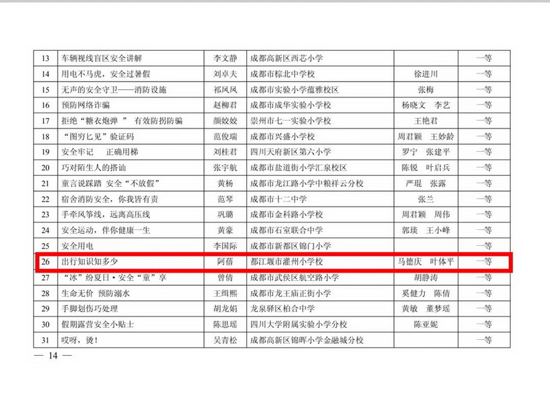 为进一步贯彻落实《成都市教育局关于开展2023年中小学安全教育优质课评选活动的通知》精神,坚持发挥课堂教学作为安全教育主阵地、主渠道作用。来自成都市各校选派的534项市级参赛作品中,我校阿蓓老师代表学校参加安全教学案例荣获一等奖。