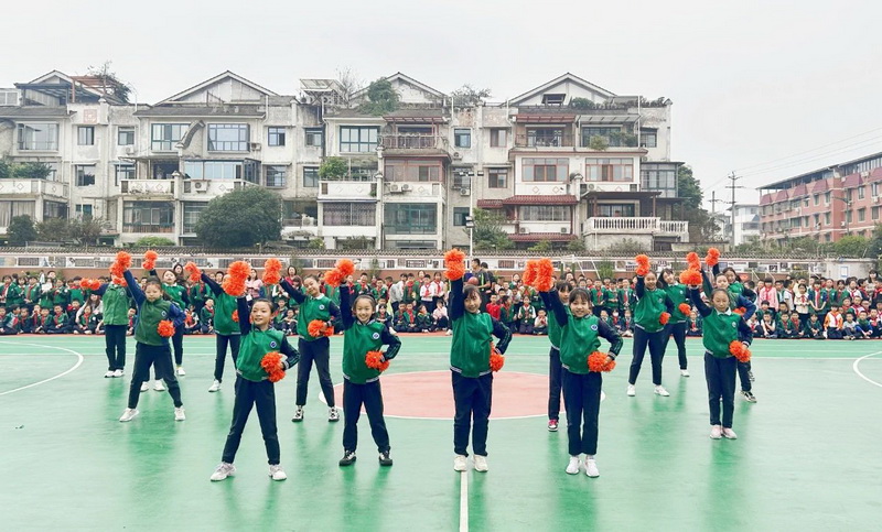 中场休息,我校啦啦队代表队在观众的欢呼声中登场,他们用干净利落、整齐划一的动作点燃了现场观众的热情,也为本场比赛加油助威。