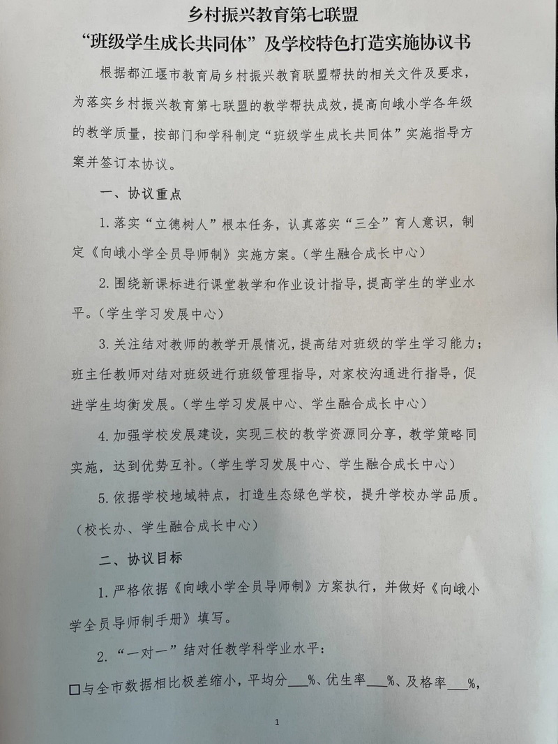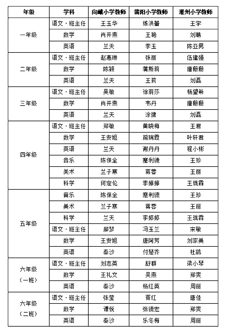 灌州小学、蒲阳小学老师与向峨小学各年级的27个学科教学班的老师签订了“班级学生成长共同体”三方协议,确定了结对任教学科的学业水平目标以及相关教研活动的规划开展。