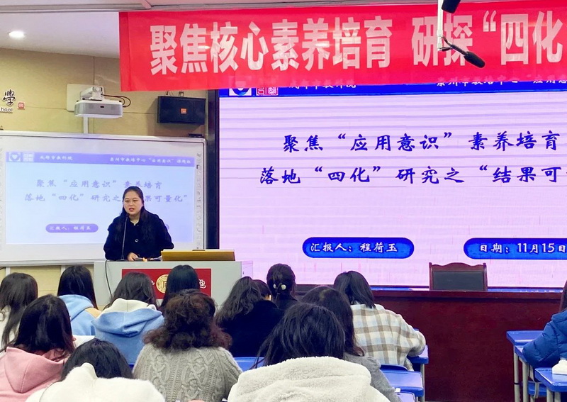 七一实验小学的程荷玉老师分享了“聚焦‘应用意识’素养培育落地‘四化’研究之‘结果可量化’”的研究成果。程老师结合数学活动观察量表和应用意识评价量表,反馈了学生应用意识和符号意识的学能数据。