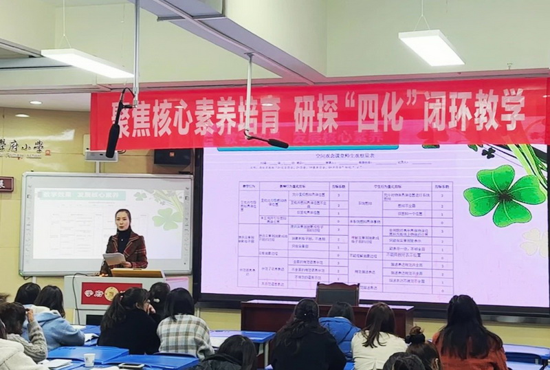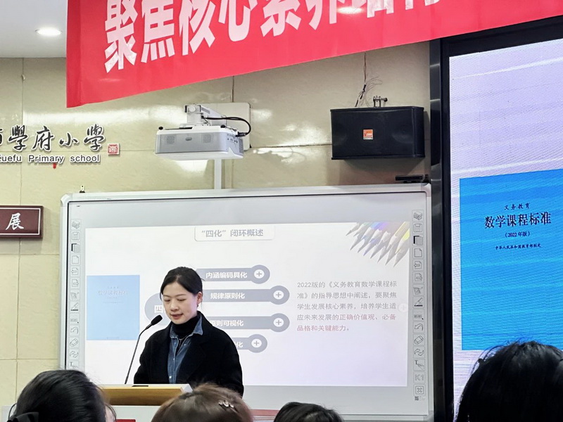 In order to enhance regional exchanges and cooperation, promote the balanced development of education in our city, deeply practice the spirit of the 2022 version of the new curriculum standard, improve the professional level of teachers and promote the cultivation process of students' subject core literacy. On November 15, 2023, Chengdu Primary school mathematics "Four Modernizations" landing subject core literacy training and Dujiangyan and Chongzhou joint teaching and research activities were carried out in Chongzhou Xuefu Primary School. The activity was sponsored by Chengdu Institute of Education and Science, and co-hosted by Dujiangyan Primary and Secondary Education Laboratory and Chongzhou Education and Training Center. Zhang Birong, Deputy Director of Basic Education Institute of Chengdu Institute of Education Science and Mathematics Teaching and Research officer of Chengdu Primary School, as well as teachers and key teachers from Pengzhou City, Xindu District, Jianyang City, Dongbei New District, Qingbaijiang District, Xinjin District, Qingyang District and Qionglai City attended the event. Dujiangyan Primary School mathematics teaching and research teacher Hu Tao and her team, Chongzhou Education and Training Center Primary School mathematics teaching and research teacher Chen Hong and teacher Yu Fengjun and their teams, Chongzhou Xuefu Primary School principal Zhu Xiangdong and Dongguan Primary School principal Zhang Wen and their teams participated in the activity.