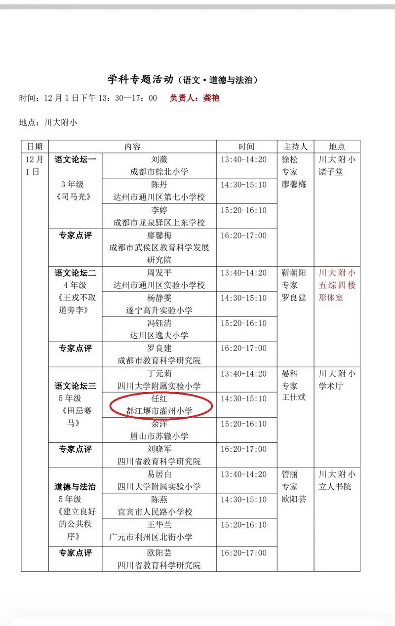 为了贯彻落实党和国家对新时代教育高质量发展的新要求,践行《关于实施新时代基础教育扩优提质行动计划的意见》精神,深化与推广新时代高品质学校建设成果,进一步提升小学办学质量,推进义务教育优质均衡发展,12月1—2日在四川大学附属实验小学举行四川省第三十一届小学教育教学改革研究共同体学术研讨会,我校任红老师在小学语文论坛献课。