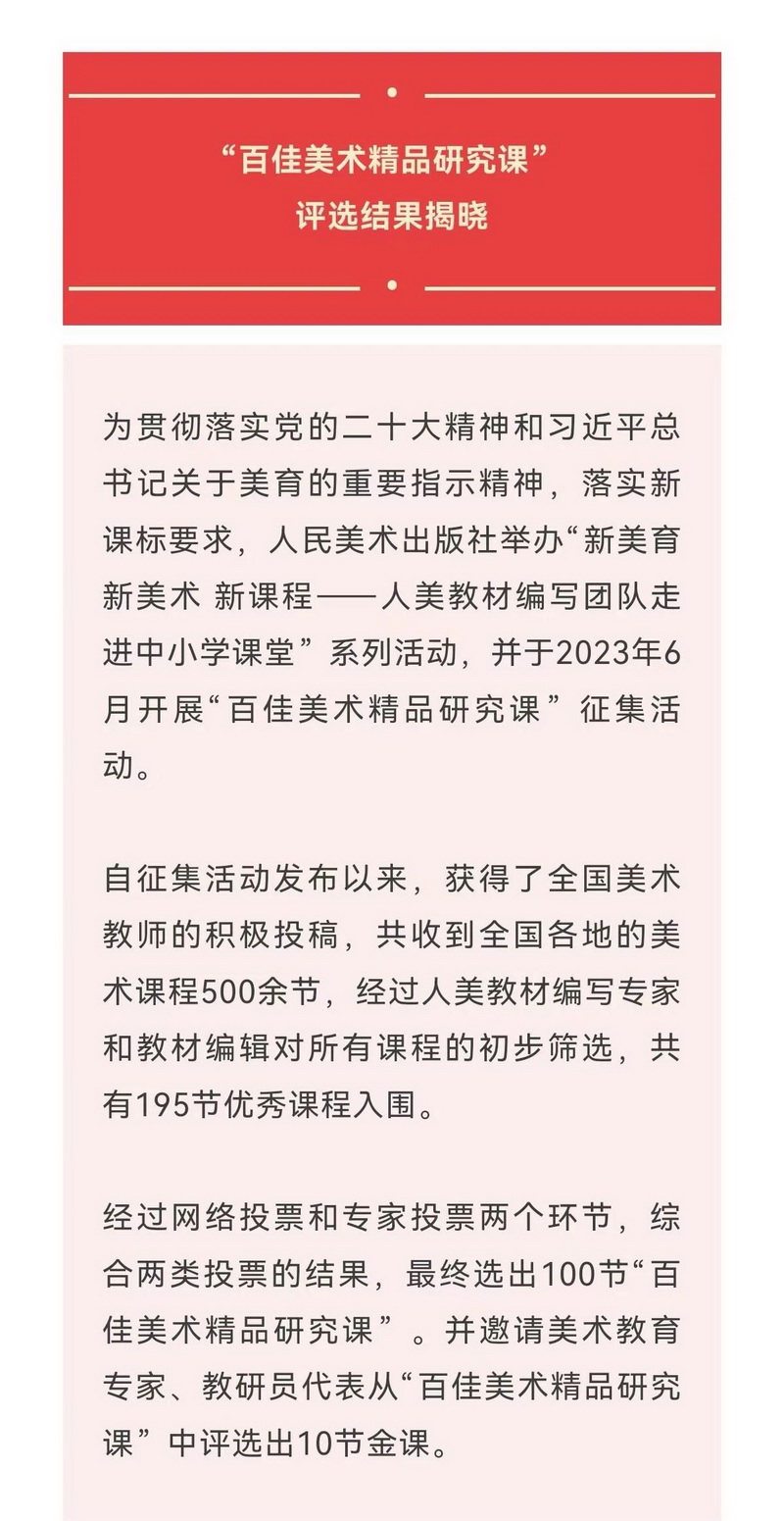 2023年12月5日,我校王丽老师凭借其《家乡的美食》课程在全国“百佳美术精品研究课”中荣获金课,全国共10节金课。此课程从500多节优秀美术课程中脱颖而出,获得了广泛的认可。