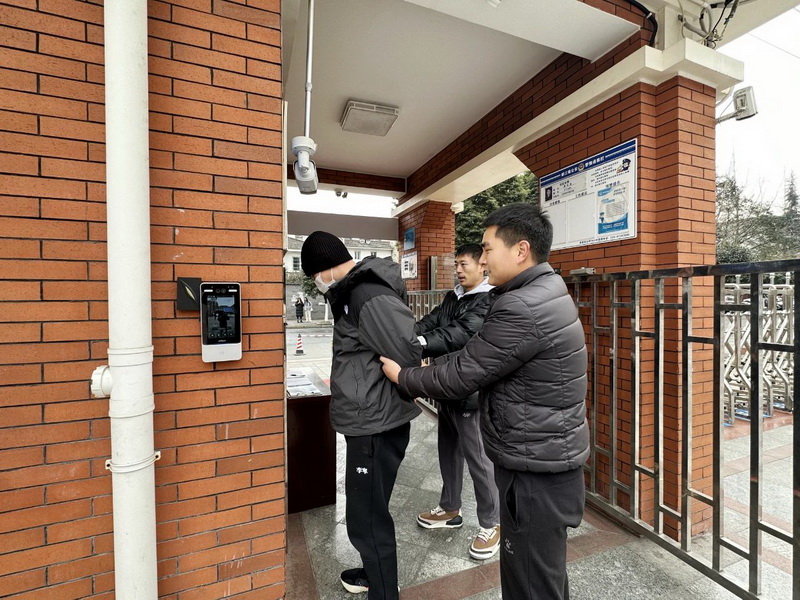19日下午时分,由我校两名体育教师扮演的蒙面男子强行冲进校门,想向教学楼冲去。值周安保发现情况不对,迅速上前阻止;其中一名安保迅速启动校园“一键式”紧急报警系统,校门值周行政迅速给校长打电话。