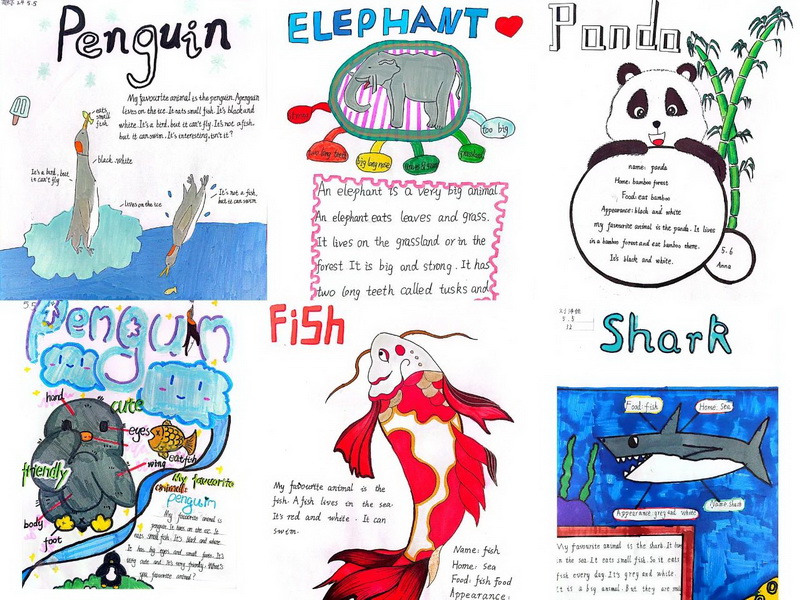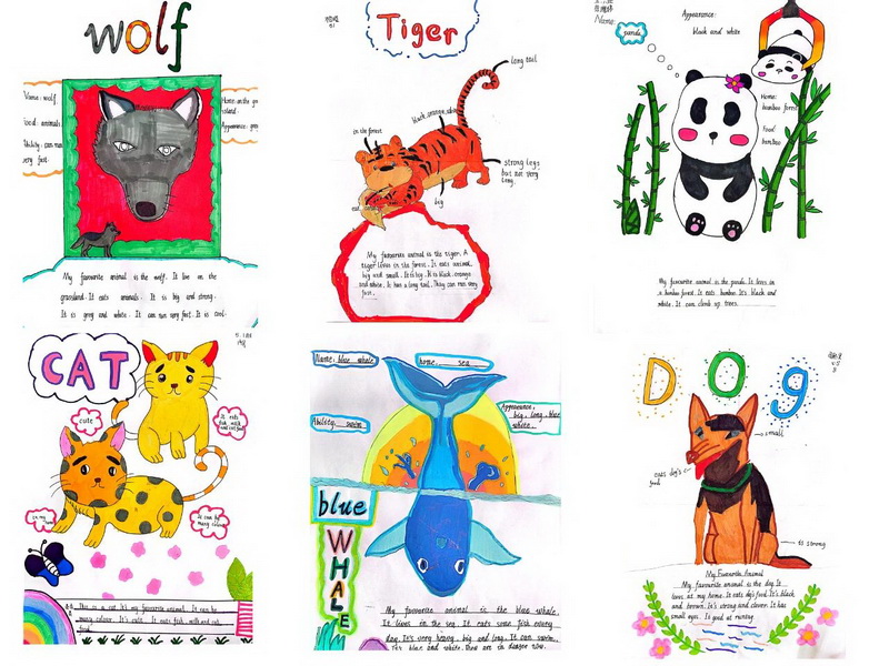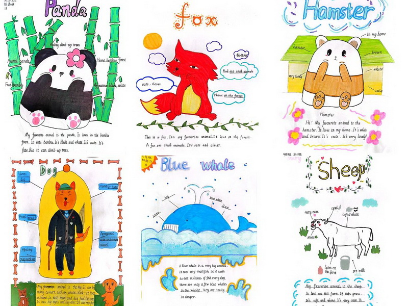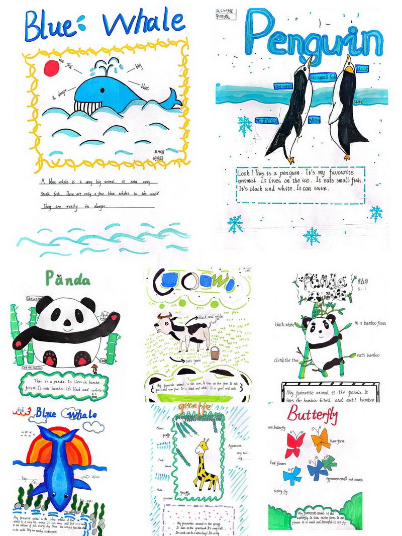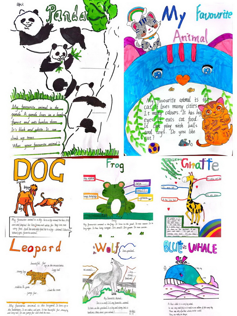Our English Senior Group has carried out a series of special English themed activities. 这次英语活动展示的主题涉及新课标中人与社会、人与自然、人与自我三大主题,为学生们的英语创作和个性化展示搭建了舞台,激发学生的英语学习兴趣,充分展现主题式的学科育人。 This English activity stimulates students' interest in English learning and fully demonstrates the thematic discipline education 五年级学生以My Favourite Animal为主题,通过自己创作的方式,介绍自己最喜欢的动物。不仅达到学以致用的目的,同时也丰富了学生的学习活动,体验到英语学习的乐趣,培养孩子们的创新能力和实践能力。