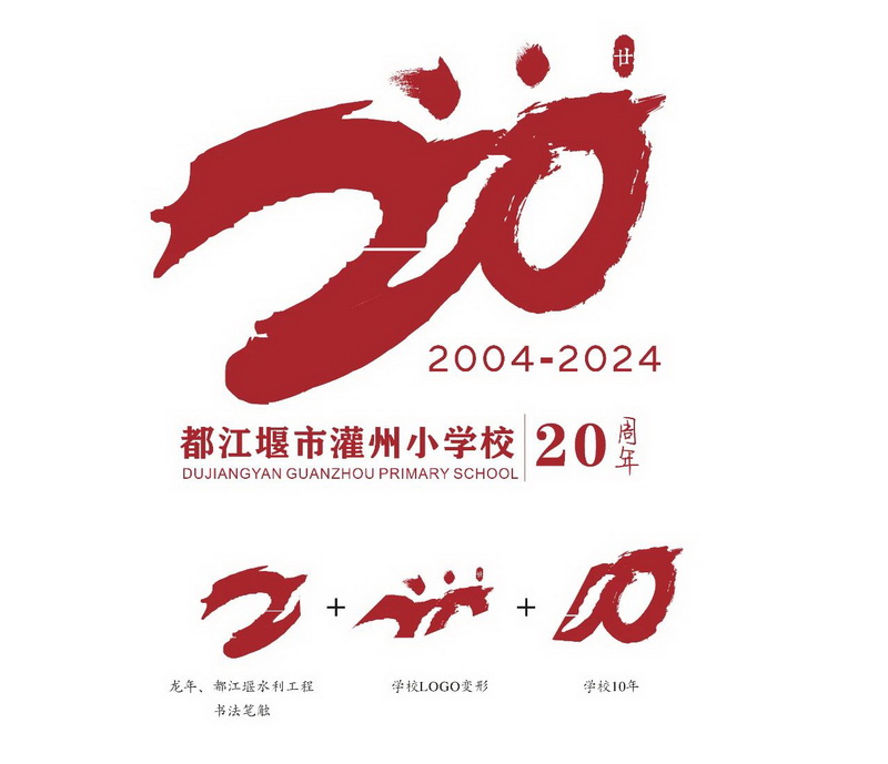 灌州小学校二十周年校庆标识以学校的“校徽”变形、都江堰水利工程、数字10”为设计核心元素,构成数字“20”。活动标识以校徽造型,代表家校社协同育人,培养着至善向美的莘莘学子;以都江堰水利工程整体造型;代表扎根都江堰教育,不忘育人初心和使命;数字“10”,代表自学校创办以来砥砺前行,走过了又一个办学历史的十年。
