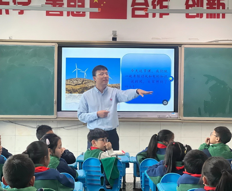 Class 4.6 Li Pei's father brought the interesting lesson of "Wind and Electricity" to the children, leading the children into the art of nature and feeling the power of nature.