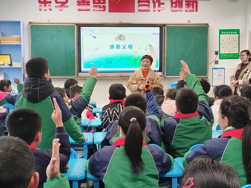 5.5班吕桢炀家长与孩子们深度互动,畅谈感恩。Class 5.5 Lu Zhenyang's parents interacted deeply with the children and talked freely about gratitude.