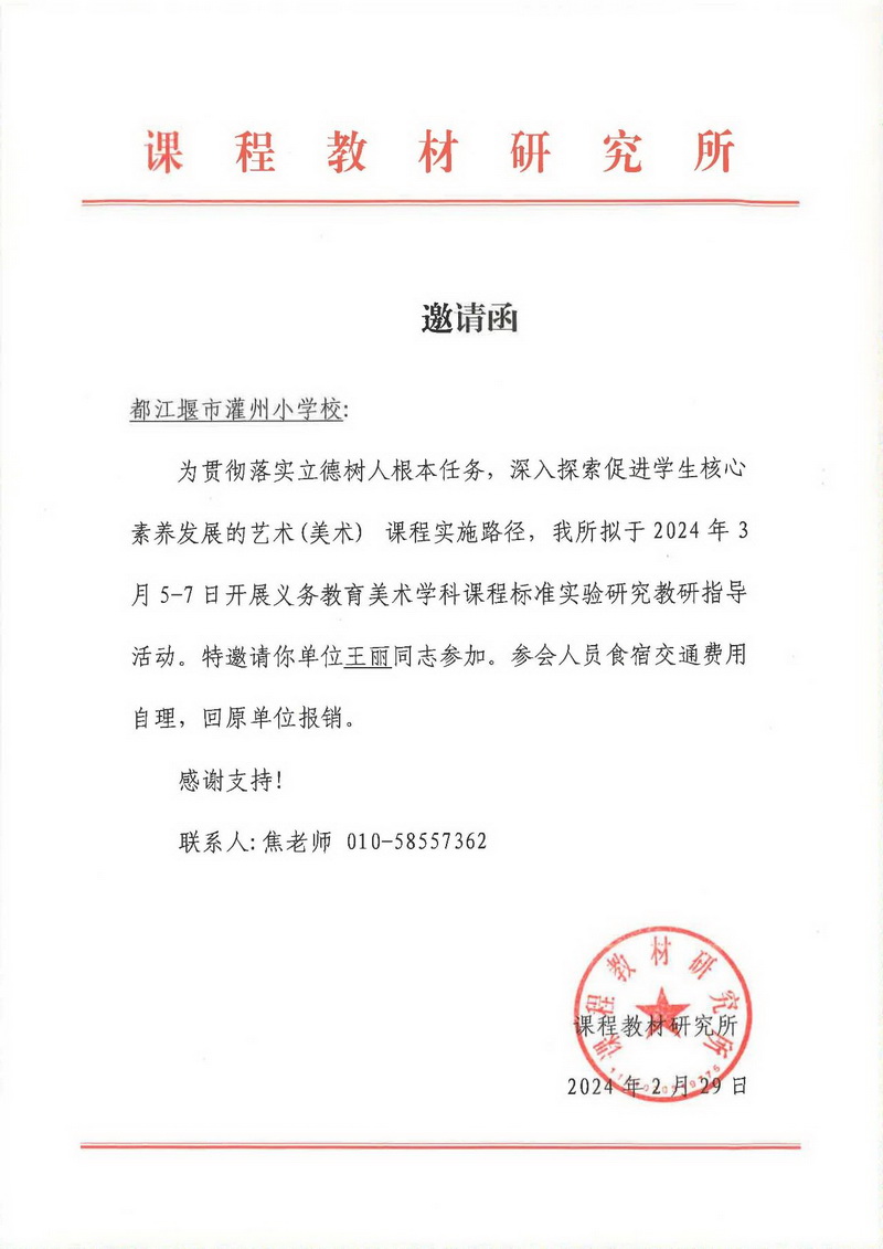 2024年3月6日,义务教育艺术(美术)课程标准实验研究项目教师培训与指导活动在温江王府外国语学校举行,我校王丽老师受课程教材研究所的邀请参加此次活动。