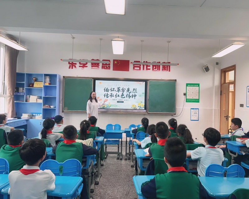 党员教师代表王娅老师告诉队员们要珍惜来之不易的幸福生活,呼吁全体队员高举先辈传过的红旗,将红色基因厚植于心、付诸于行,传承英雄遗志,在新时代的征程中书写自己的追梦华章。