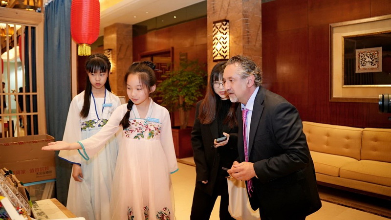 活动中,孩子们用流利的英语向来宾介绍了我校特色项目“泥塑”和传统版画“印章明信片”的制作方法,传播优秀传统文化。
