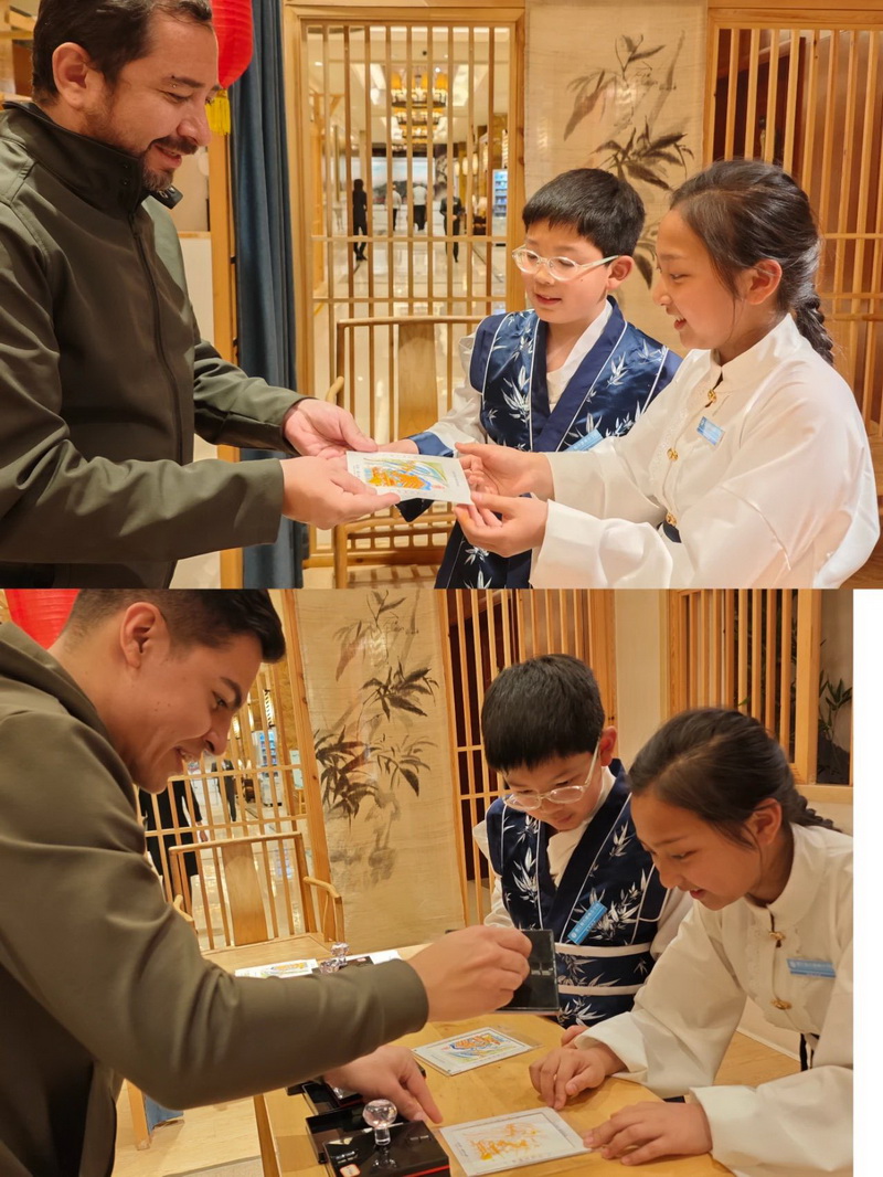 During the activity, the children introduced the production methods of our school's characteristic project "clay sculpture" and traditional printmaking "seal postcards" to the guests in fluent English, spreading excellent traditional culture.