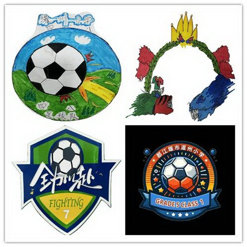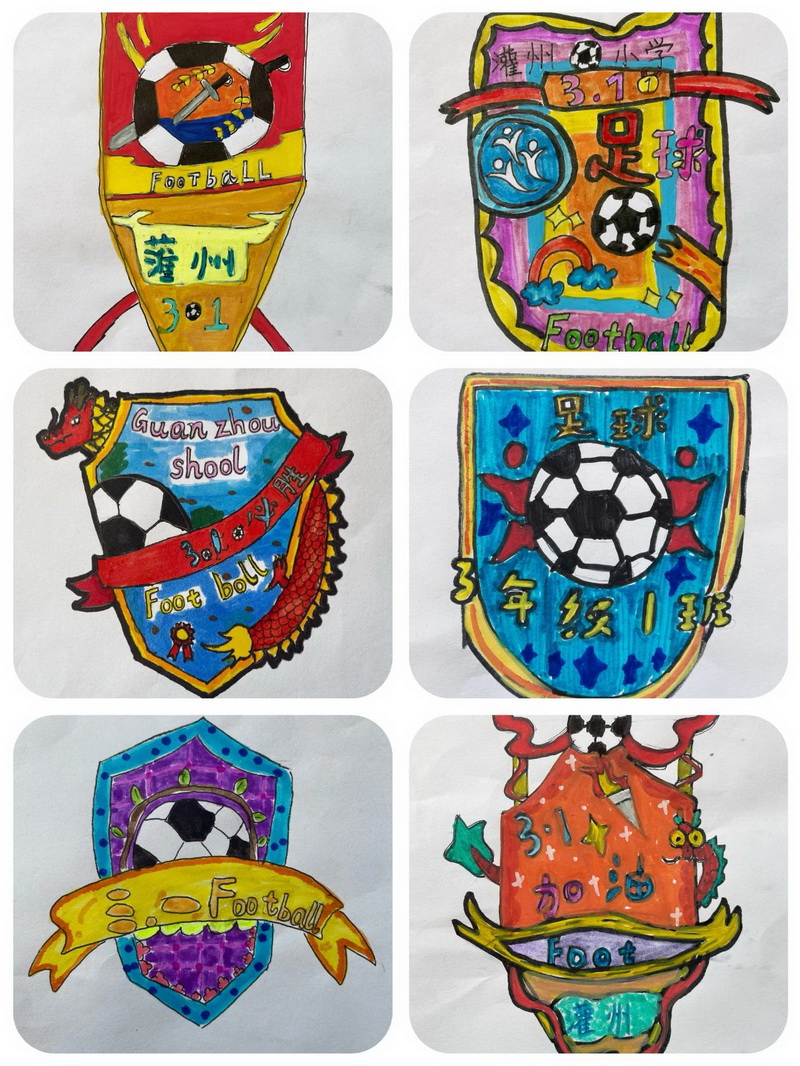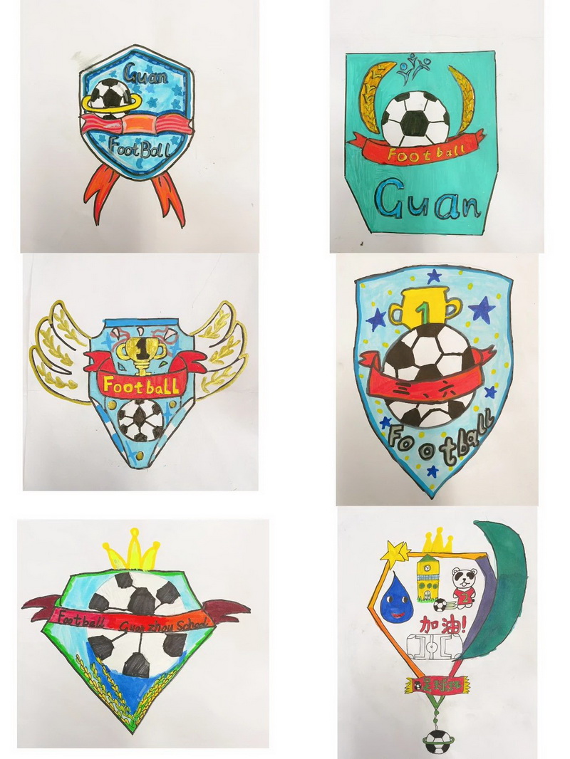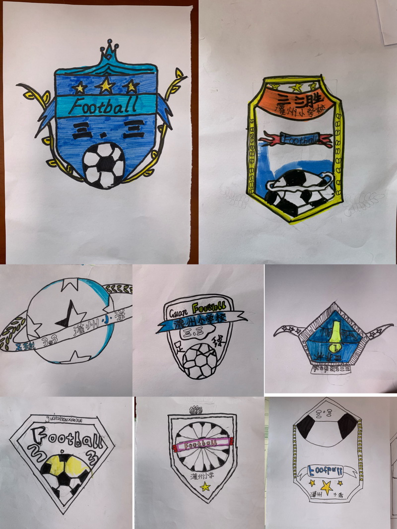 足球比赛 本次“堰宝杯”足球赛分为三个部分,第一部分由各年级在美术课上设计自己班级的队徽,用于比赛APP的创建,每个同学在设计时充分发挥自己的想象,通过对足球运动的理解以及团结奋进的精神,并结合本班级的文化氛围来设计自己心目中的队徽。 This football competition is divided into three parts. The first part is to design their own class emblem in the art class.